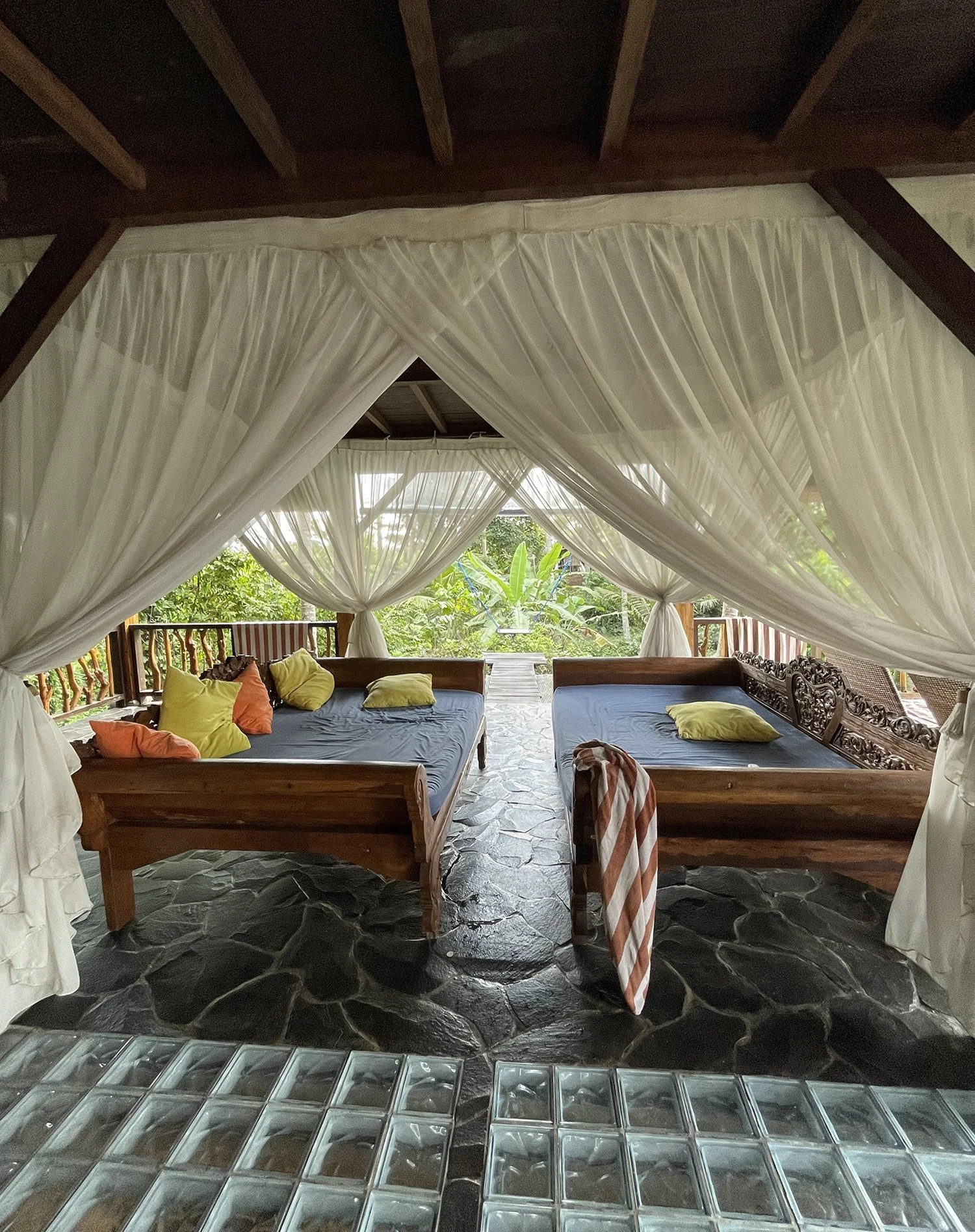 In Bali befindet sich unsere Baumhaus-Retreat-Oase in Ubud, umgeben von wunderschönen Reisfeldern und Palmen.